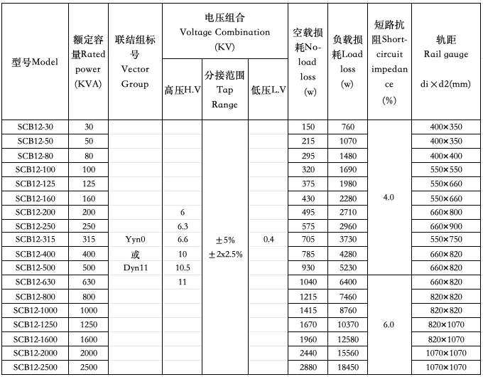 SCB12干式变压器参数表 Table of SCB12 series dry type transformer parameters