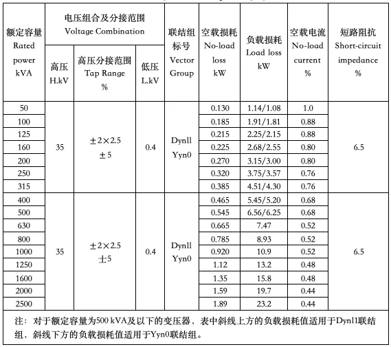 35 kV 级 5 0 kVA~2500kVA三相双绕组无励磁调压配电变压器