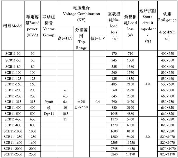 SCB11干式变压器参数表 Table of SCB11 series dry type transformer parameters